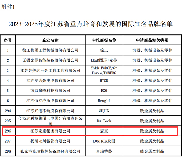 | 近日,“2023-2025年度江蘇省重點(diǎn)培育和發(fā)展的國際知名品牌”名單出爐,江蘇宏寶集團(tuán)有限公司成功入選! |