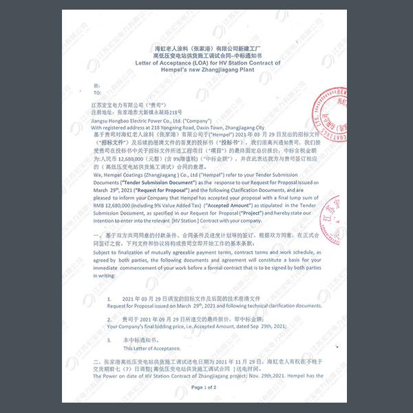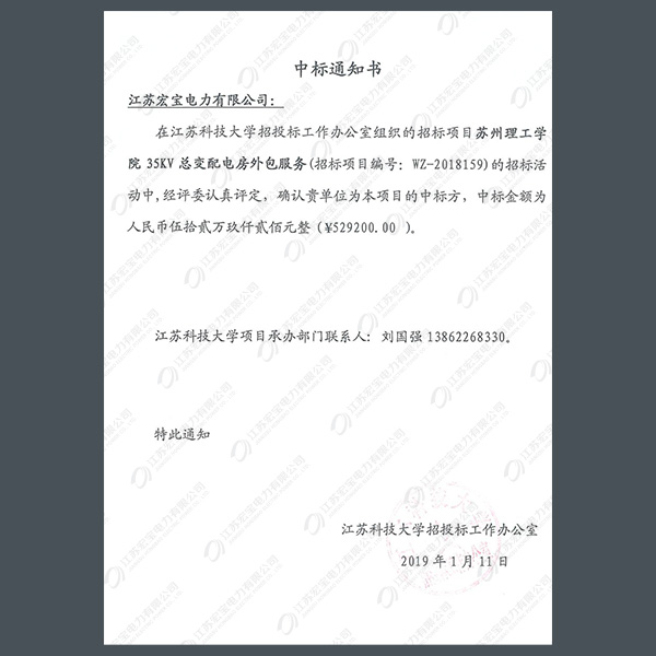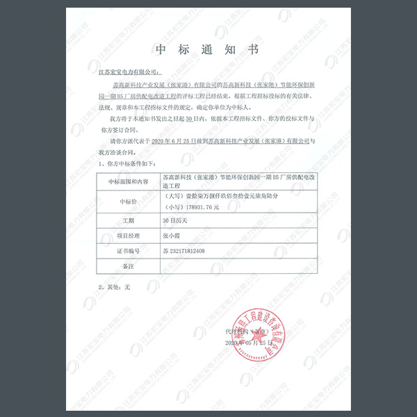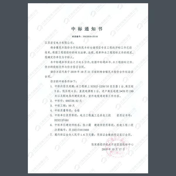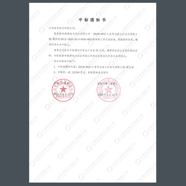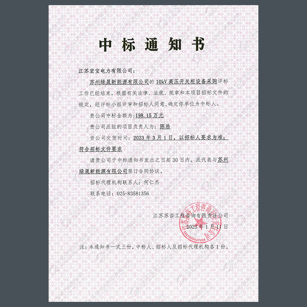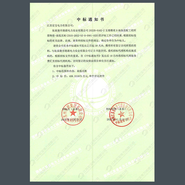 高壓柜中標(biāo)通知書(shū)