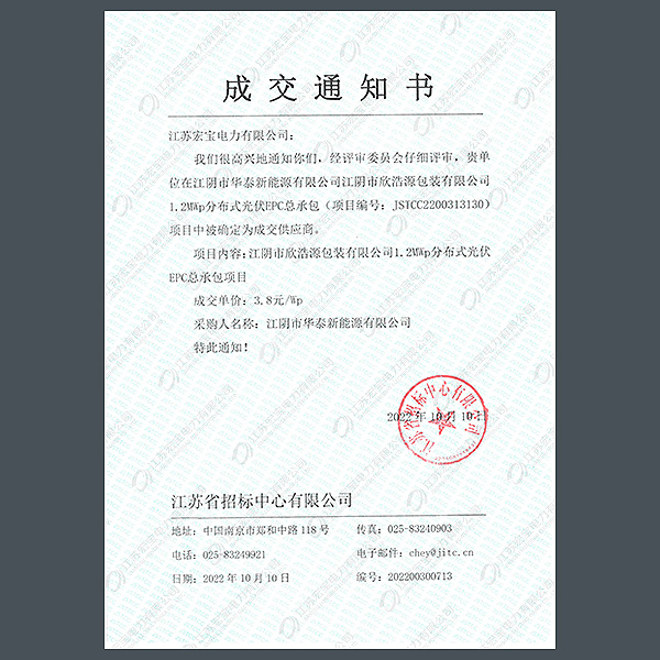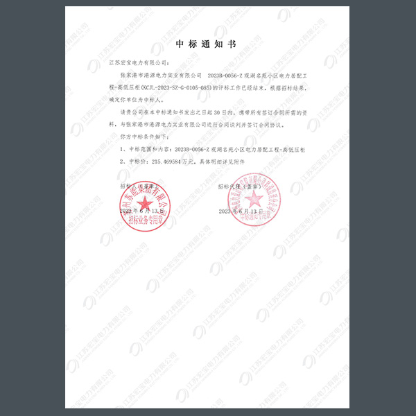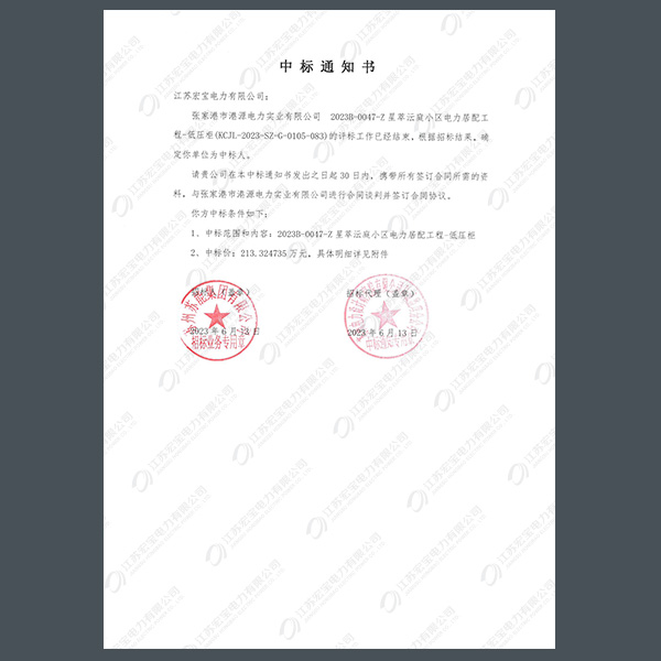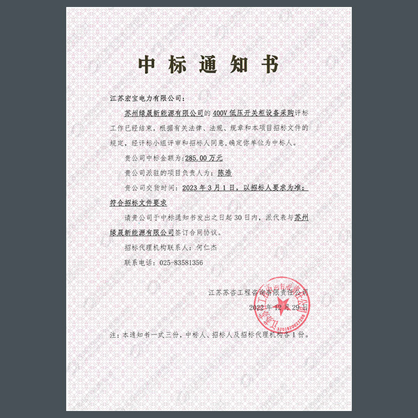 低壓柜中標(biāo)通知書(shū)