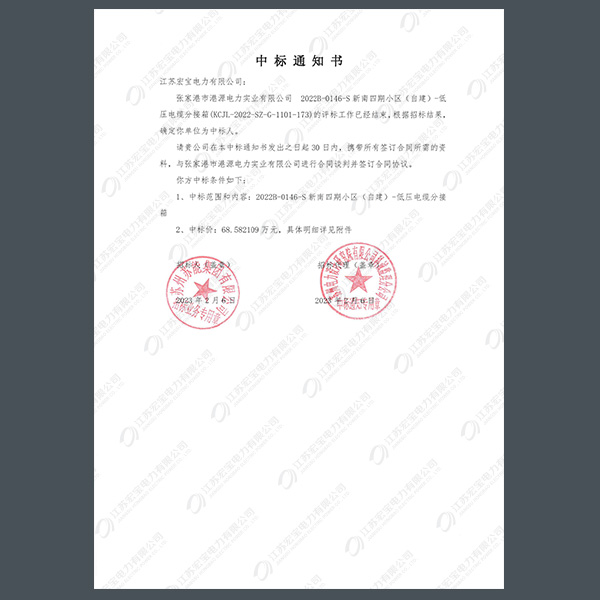 低壓電纜分接箱中標(biāo)通知書(shū)